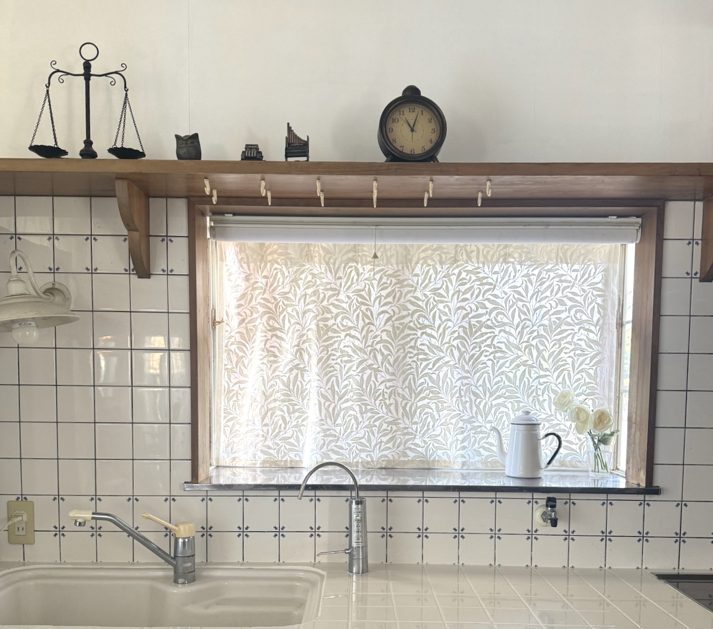 キッチンの窓には、ピュアモリス「ウィローボウ」の刺繍のファブリックを。