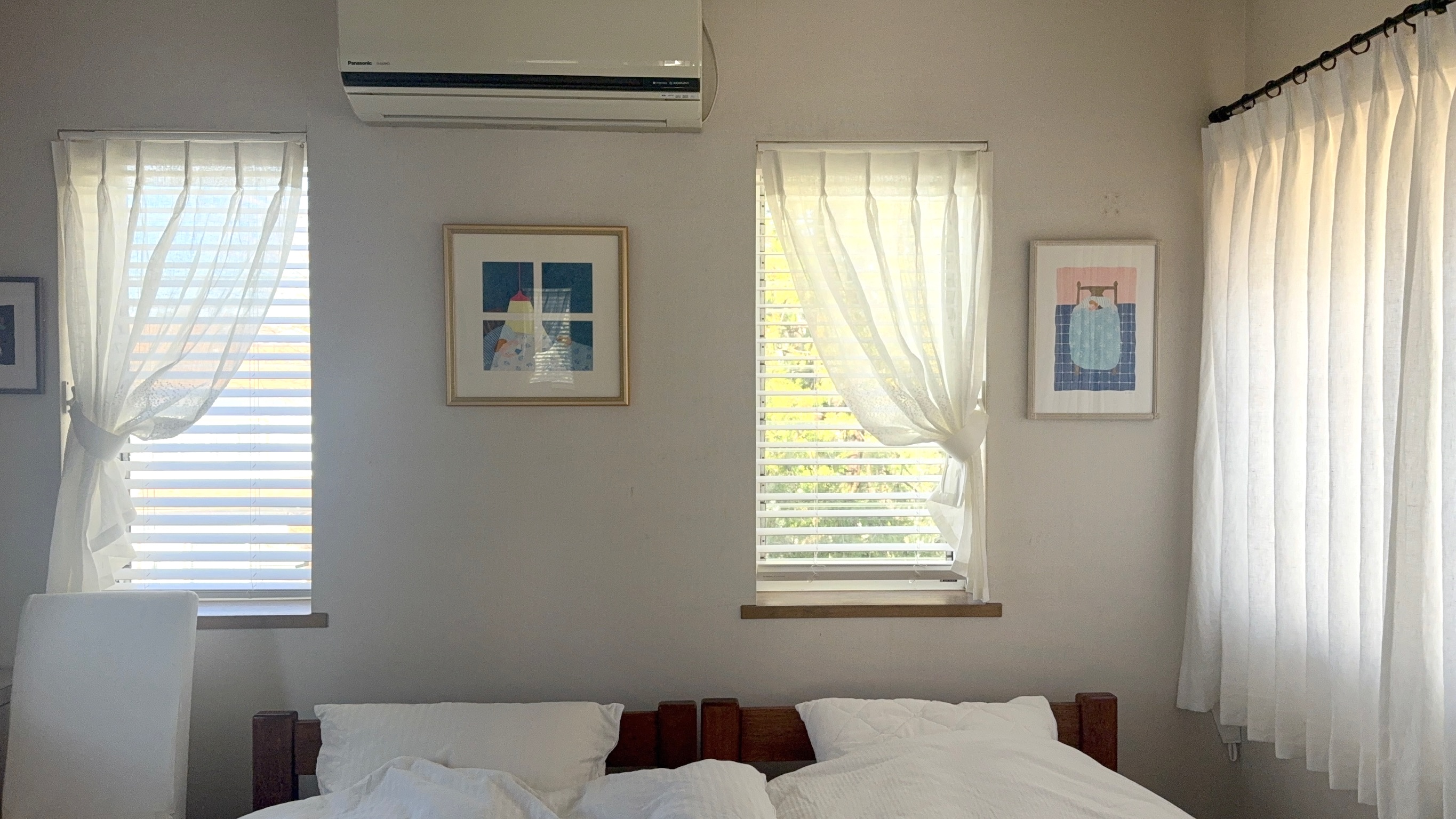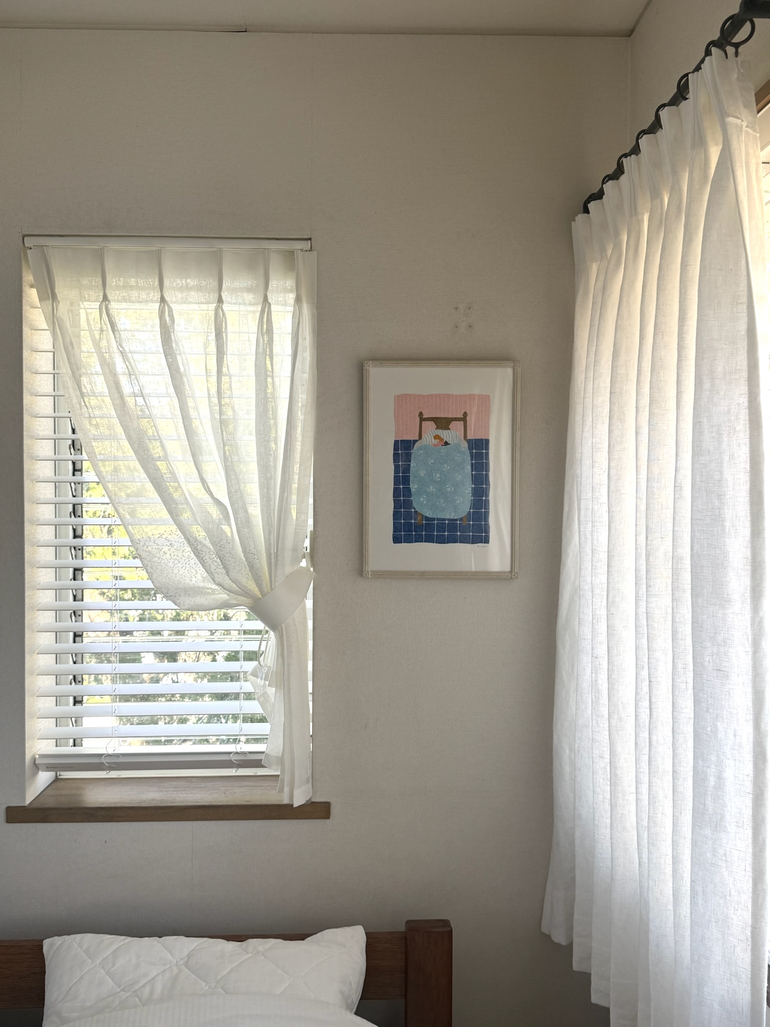 2階ゲストルームには、白の木製ブラインドとリネンのカーテンを組み合わせて。