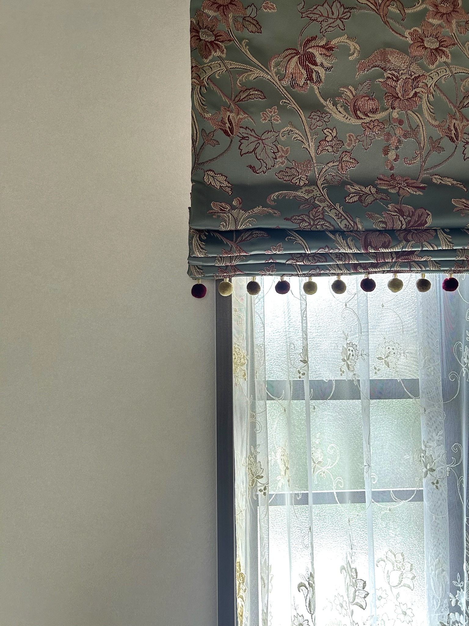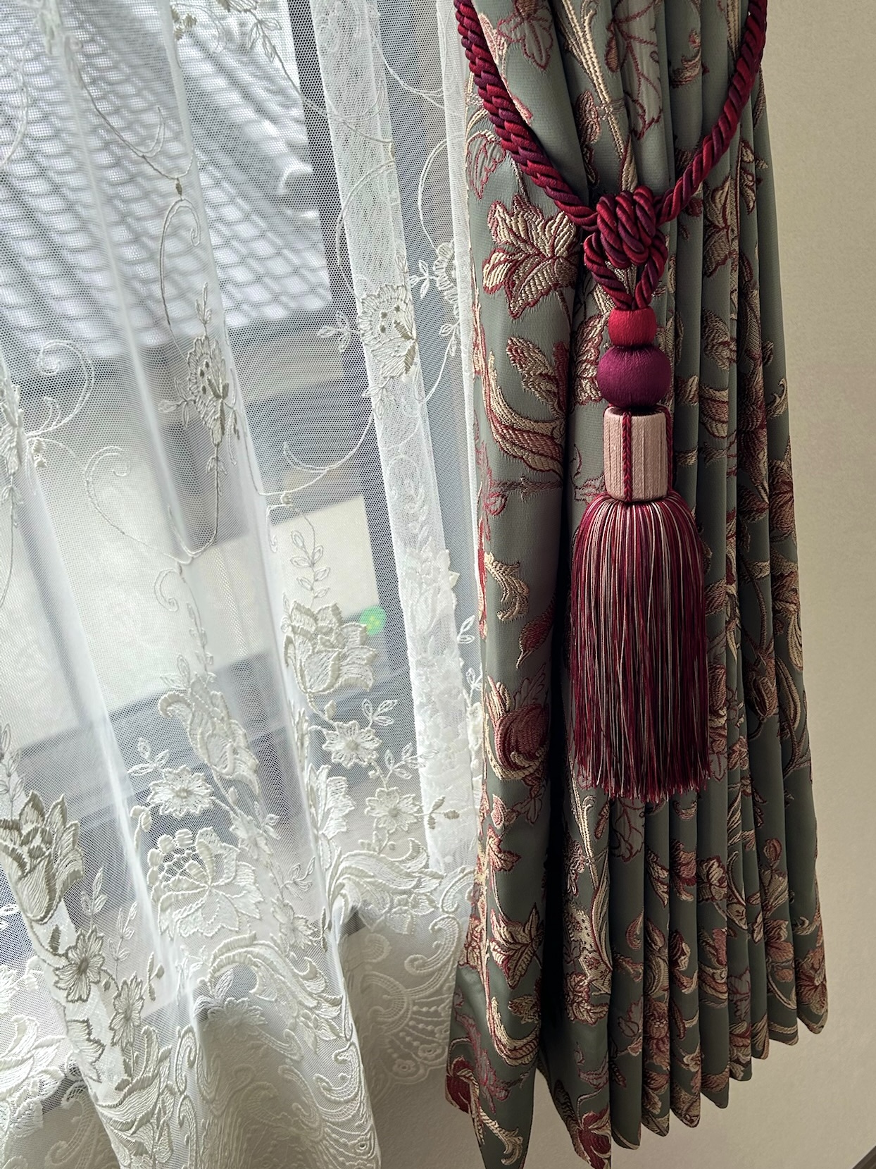 深いボルドー色のタッセルが、カーテンを優雅にキュッとまとめました。