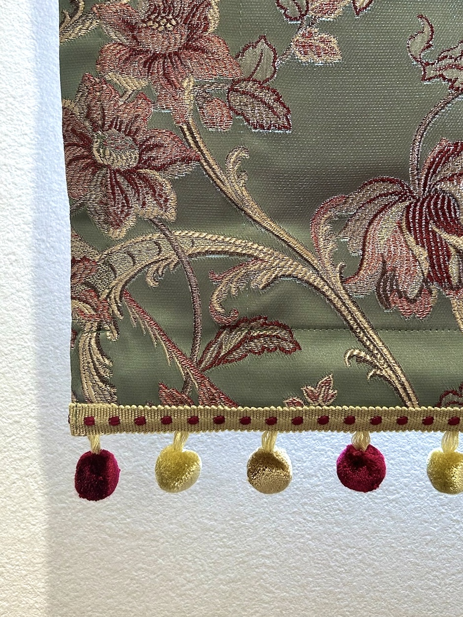 シノワズリの落ちついた美しさが際立つ生地に、裾にはあえて可愛らしいボンボンのフリンジをあしらいました。
