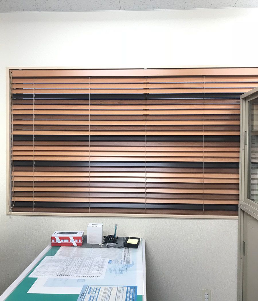 こちらの事務所は大きめの窓でしたので、今回は雰囲気のあり、しかも丈夫である木製ブラインドを採用いたしました。